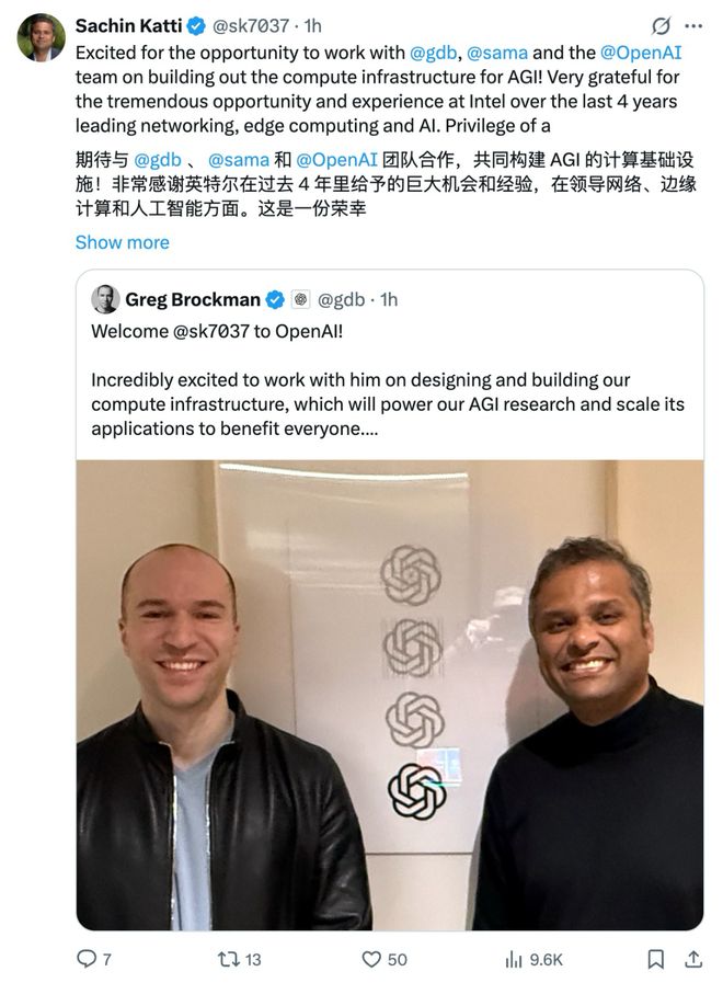 英特尔首席手艺取人工智能官萨钦・卡蒂(Sachin Katti)已确认去职,插手 OpenAI,担任建立支撑通用人工智能(AGI)的计较根本设备。